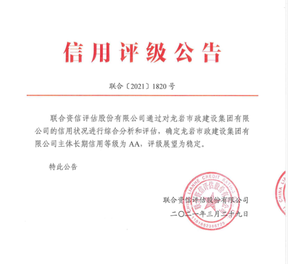 2021年3月29日,經(jīng)國內(nèi)權(quán)威評級機(jī)構(gòu)聯(lián)合資信評估有限公司評級專家集體分析、研究、決議,一致通過給予龍巖市政建設(shè)集團(tuán)有限公司AA主體信用評級,評級展望穩(wěn)定。